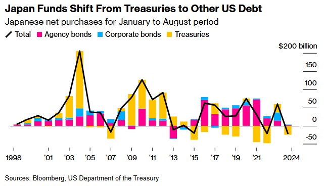 美国财政部的数据显示,今年前三个月,日本投资者是美国国债的净买家,但此后已转为卖家。今年1月至8月,日本投资者总共出售了价值244亿美元的美国国债。