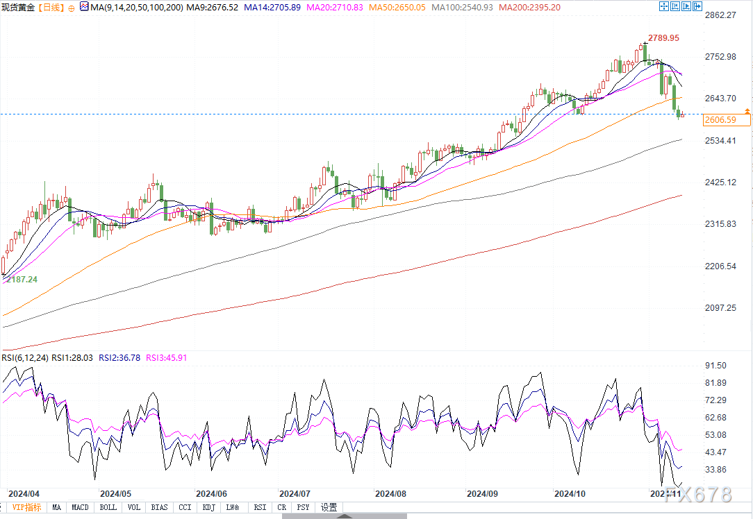 在关键数据风险出现之前,美元在近期飙升至5月初以来的最高水平后,进入看涨盘整阶段。再加上人们担心美国当选总统特朗普的保护主义关税将影响全球经济以及股市普遍走软,这为避险黄金价格提供了一些支撑。