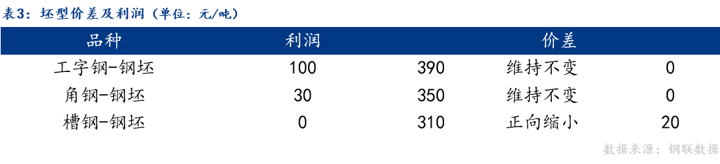 从坯型价差来看,今日槽钢与钢坯价差正向缩小。