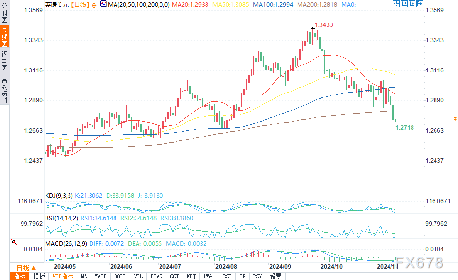 由于美元持续升值,欧元兑美元继续下滑至7个月低点,4月低点1.0602正在受到测试。跌破这一水平将触及2023年11月的低点1.0517。