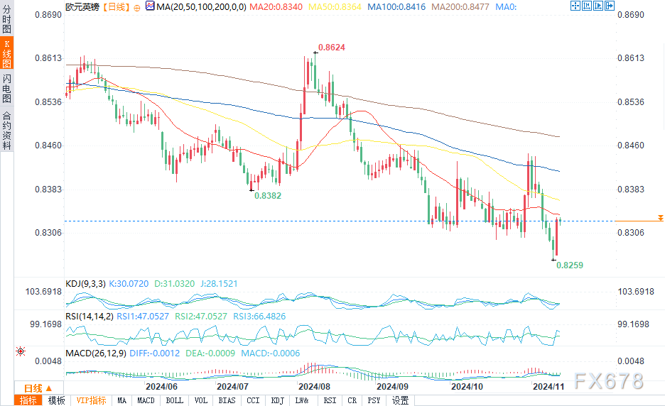 欧元兑英镑从本周的低点0.826(上一次交易是在2022年4月)迅速回升,并朝着10月24日的高点0.8352回升。如果突破,55日简单移动平均线(SMA) 0.8369将成为焦点。