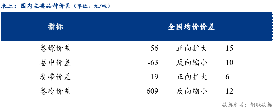 从品种价差来看,卷螺差较上一交易日正向扩大15元/吨,热中价差较上一交易日反向缩小10元/吨,热带价差较上一交易日正向扩大6元/吨,热冷价差较上一交易日反向缩小12元/吨。