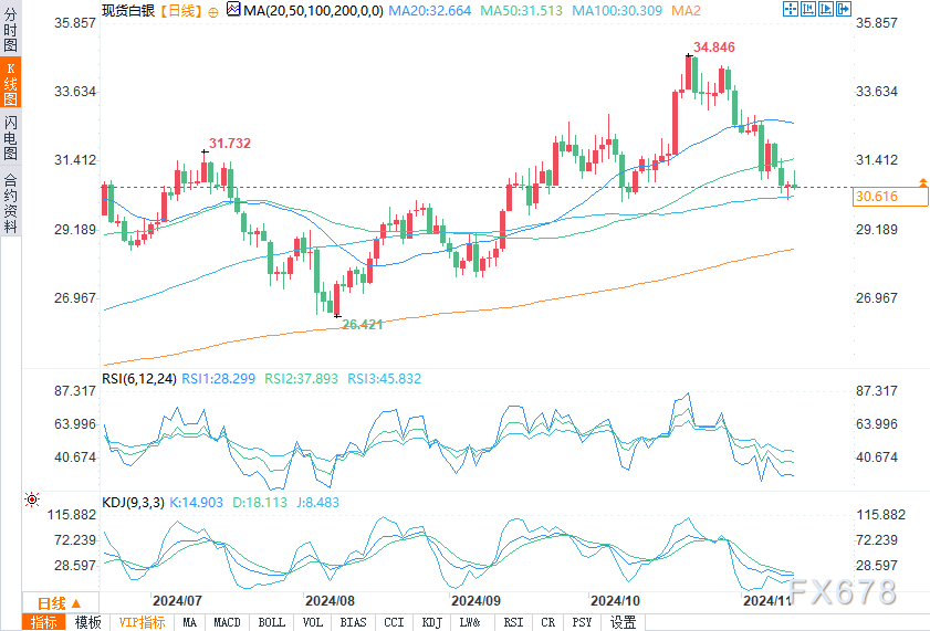 汇通财经APP讯——周三(11月13日)美盘时段,白银市场在早盘小幅反弹,美国消费者价格指数(CPI)数据基本符合预期,市场松了一口气,白银价格也因此开始上涨。随后白银价格开始转跌,盘中报30.65美元/盎司。50日移动均线略高于当前价格水平,50日移动均线水平可能会引发一点阻力,但最终,这可能只是接下来走势的一个小注脚。长期来看,市场将走向更高的水平,价格可能会到32.50美元附近水平。