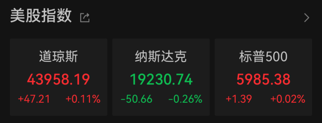 当地时间11月13日,截至收盘,道指涨0.11%报43958.19点,标普500指数涨0.02%报5985.38点,纳指跌0.26%报19230.74点。