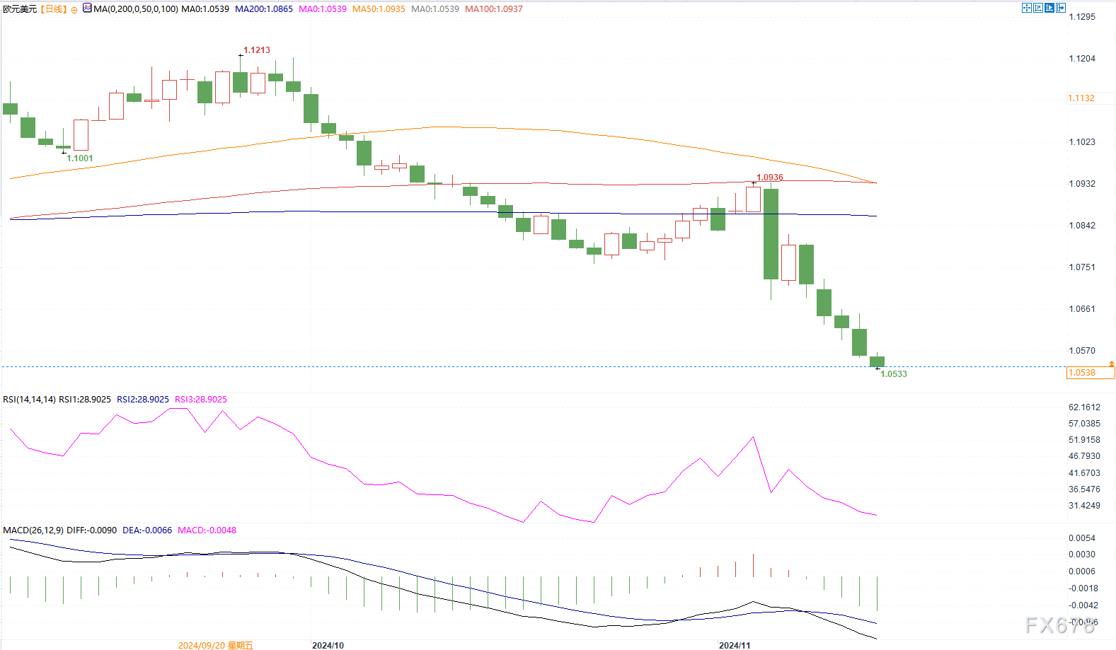 凯投宏观的高级市场经济学家James Reilly称:“自特朗普胜选以来,欧元的表现比大多数货币更为疲软,我们怀疑这种情况不会很快好转。鉴于欧洲央行的宽松措施也将超过投资者的预期,我们预计到2025年底,欧元兑美元将滑向平价。”