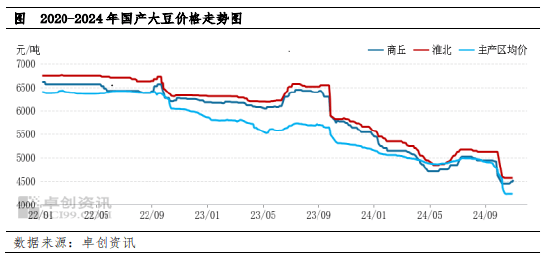 根据卓创资讯对黄淮海部分大豆产区的调研,河南、安徽、山东等传统大豆种植区今年面积整体减少三成左右,且河南、安徽个别区域在大豆生长期遭遇连续降雨,这部分区域单产较低,个别甚至不足200斤/亩,初步预估本年度黄淮海产区整体产量预估同比减少三成以上。由于10月初黄淮海主要产区价格跌至近四年低位,10月中上旬部分低价区域走货节奏较快,产区供应压力明显缓解,且随着货源水分的好转,基层种植端低价出货意愿减弱,部分产区基层种植端余货比例已经不多,整体上货节奏明显放缓,而去年同期多地正值新粮上市后的出货压力释放阶段,今年南方产区整体供应压力小于去年。