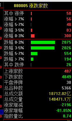 全市场上演普跌行情,共487只个股上涨,4849只个股下跌。