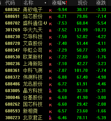 下跌方面,半导体板块延续调整,甬矽电子跌超10%。