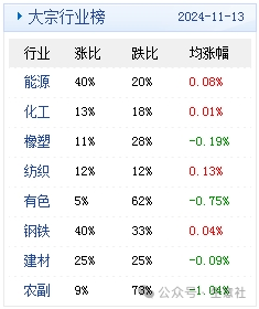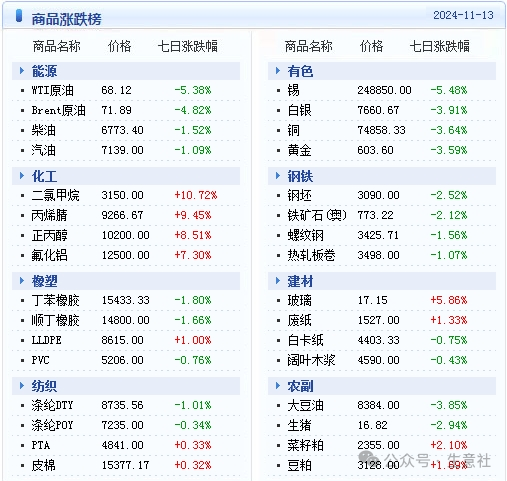 | 商品 | 行业 | 11月13日 | 单位 | 日涨跌 |