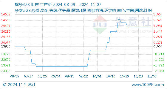 11月7日,生意社棉纱32S基准价为24400.00元/吨,与本月初持平。