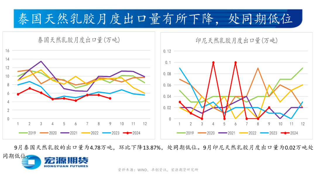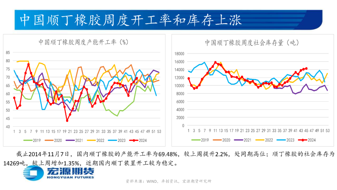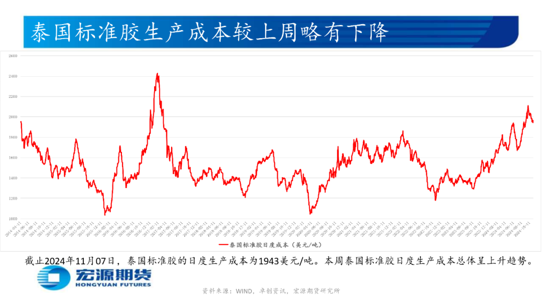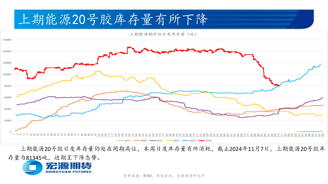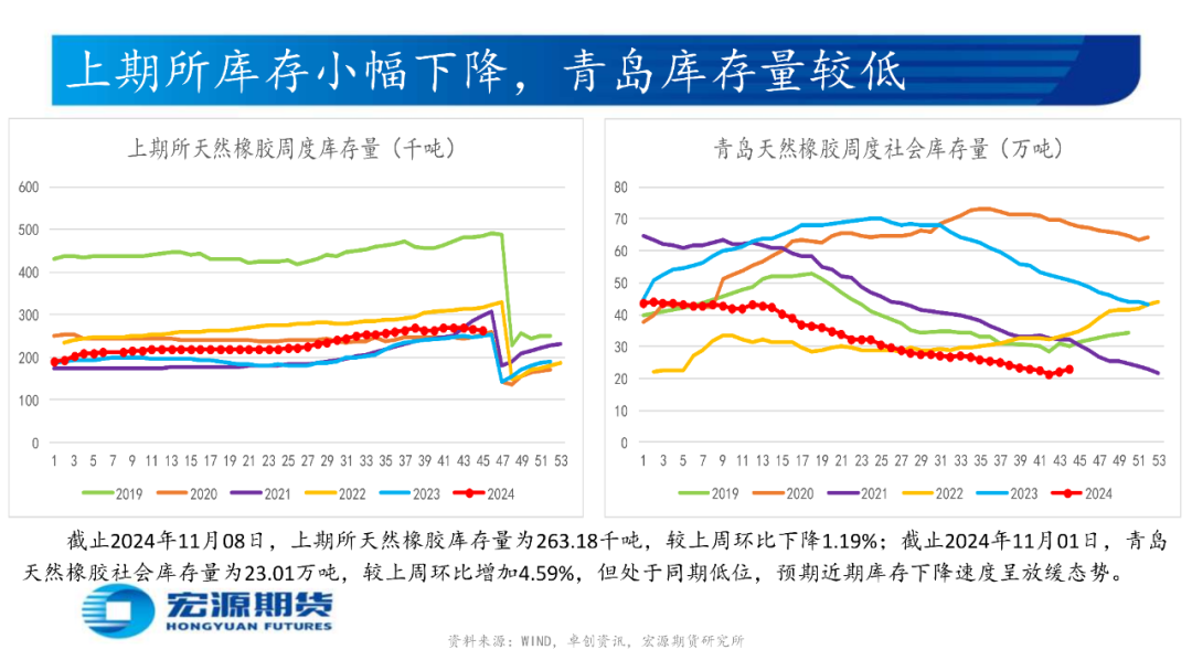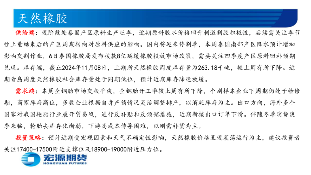性上量结束后的产区周期转向对原料供应的影响。国内将迎来停割季,本周泰国南部产区降水预计增加影响交割作业,6日泰国橡胶局发布拨款8亿延缓橡胶投放市场政策,需要关注四季度产区原料回补预期兑现。库存端,截止2024年11月08日,上期所天然橡胶周度库存量为263.18千吨,较上周有所下降。近期青岛周度天然橡胶社会库存量处于同期低位,预计近期库存降速放缓。