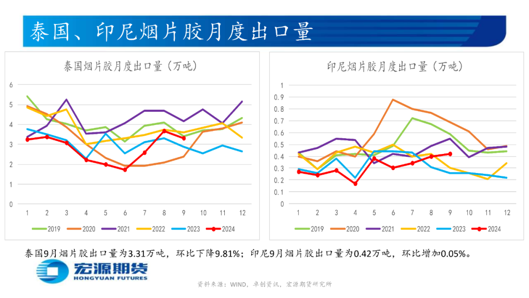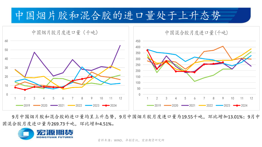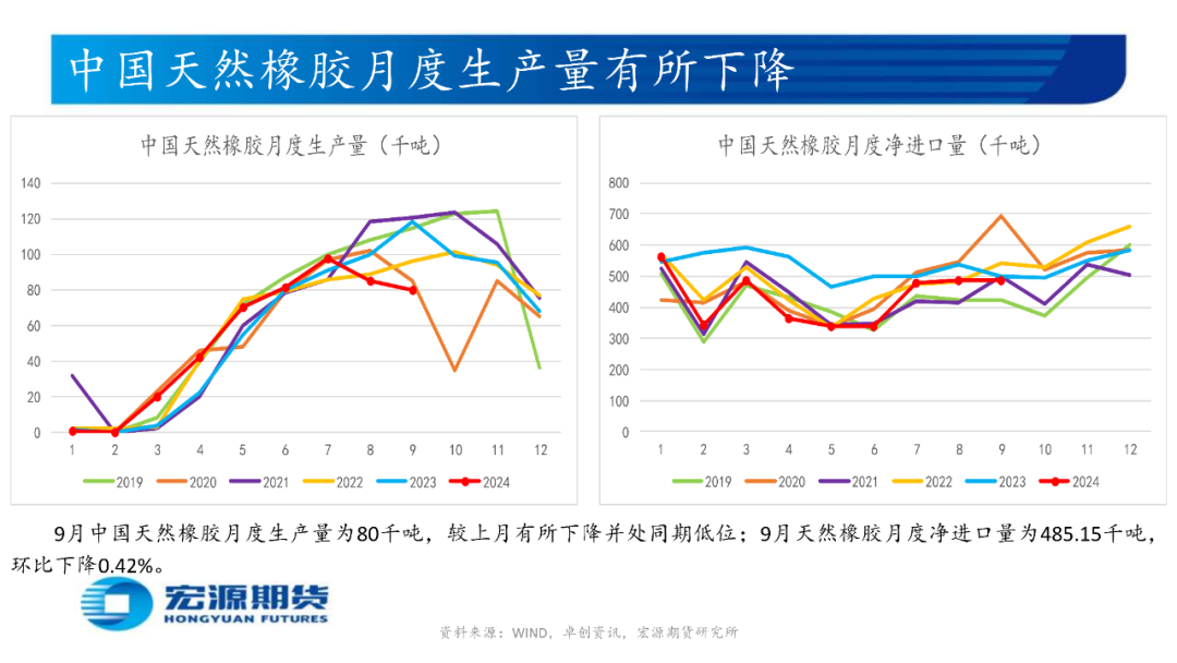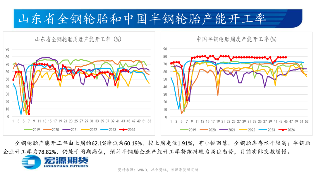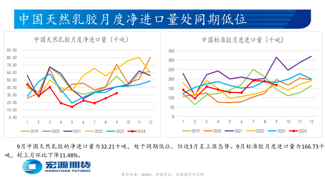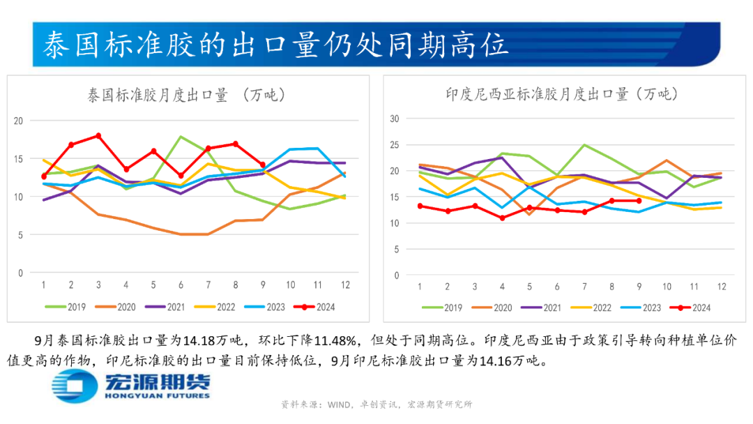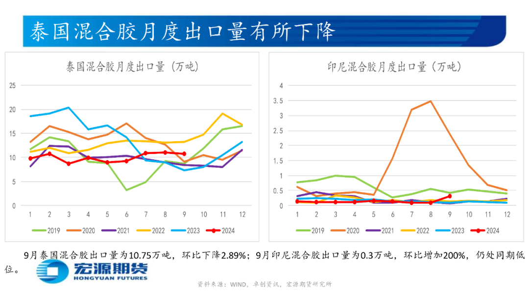 性上量结束后的产区周期转向对原料供应的影响。国内将迎来停割季,本周泰国南部产区降水预计增加影响交割作业,6日泰国橡胶局发布拨款8亿延缓橡胶投放市场政策,需要关注四季度产区原料回补预期兑现。库存端,截止2024年11月08日,上期所天然橡胶周度库存量为263.18千吨,较上周有所下降。近期青岛周度天然橡胶社会库存量处于同期低位,预计近期库存降速放缓。