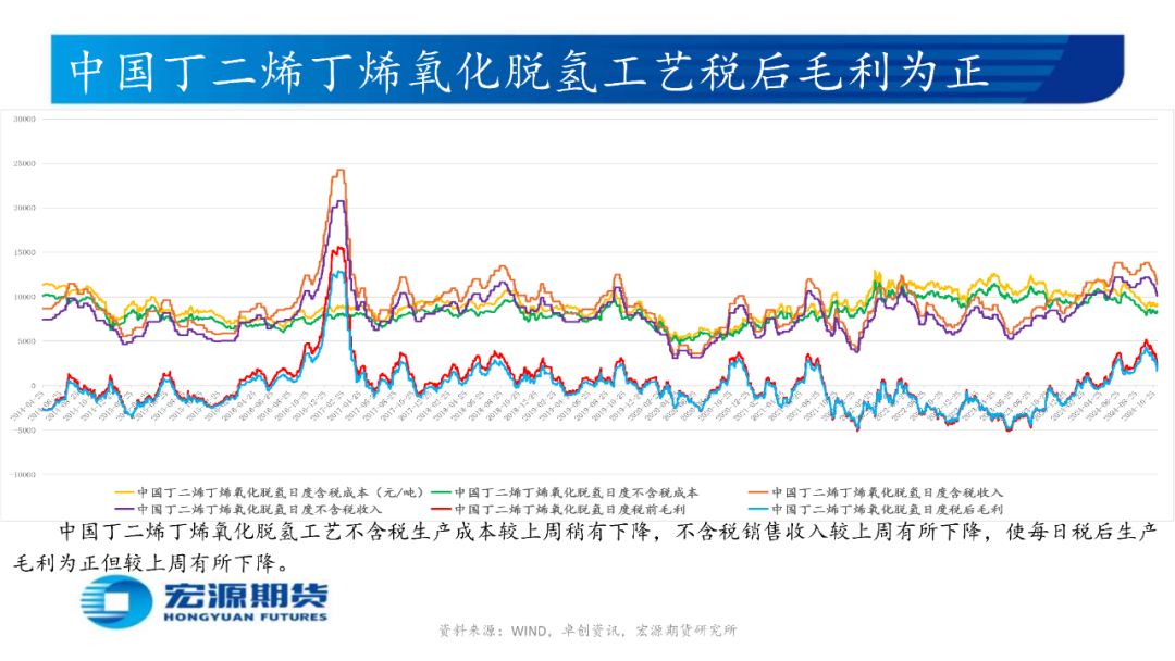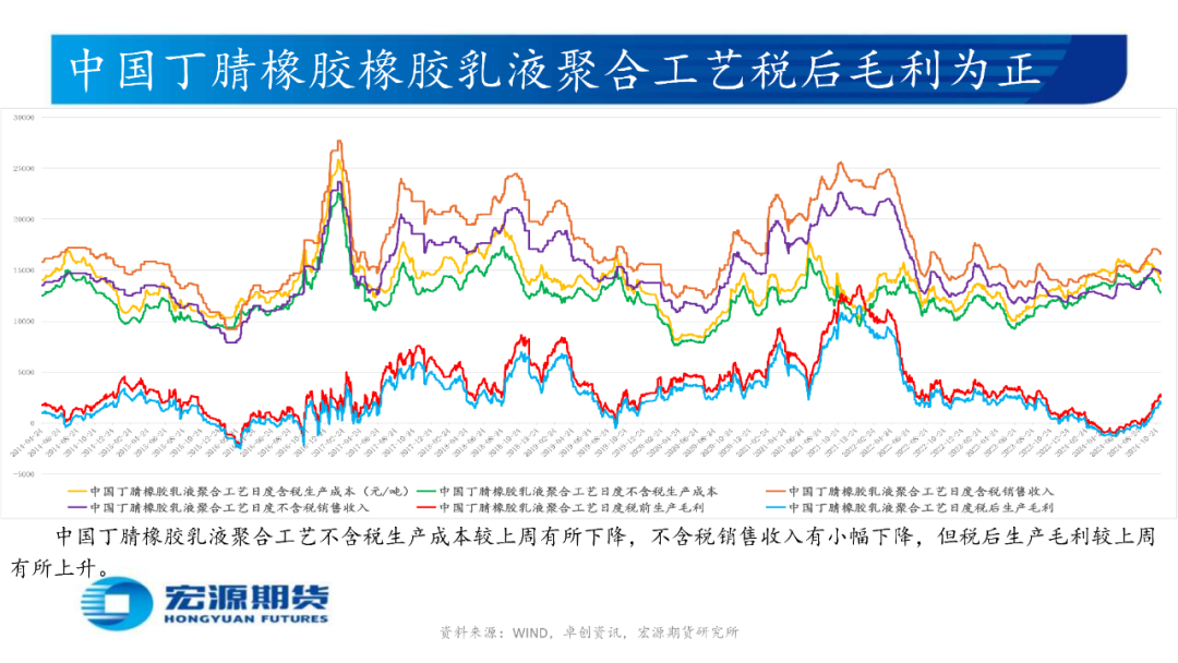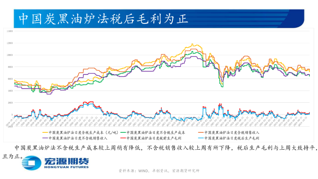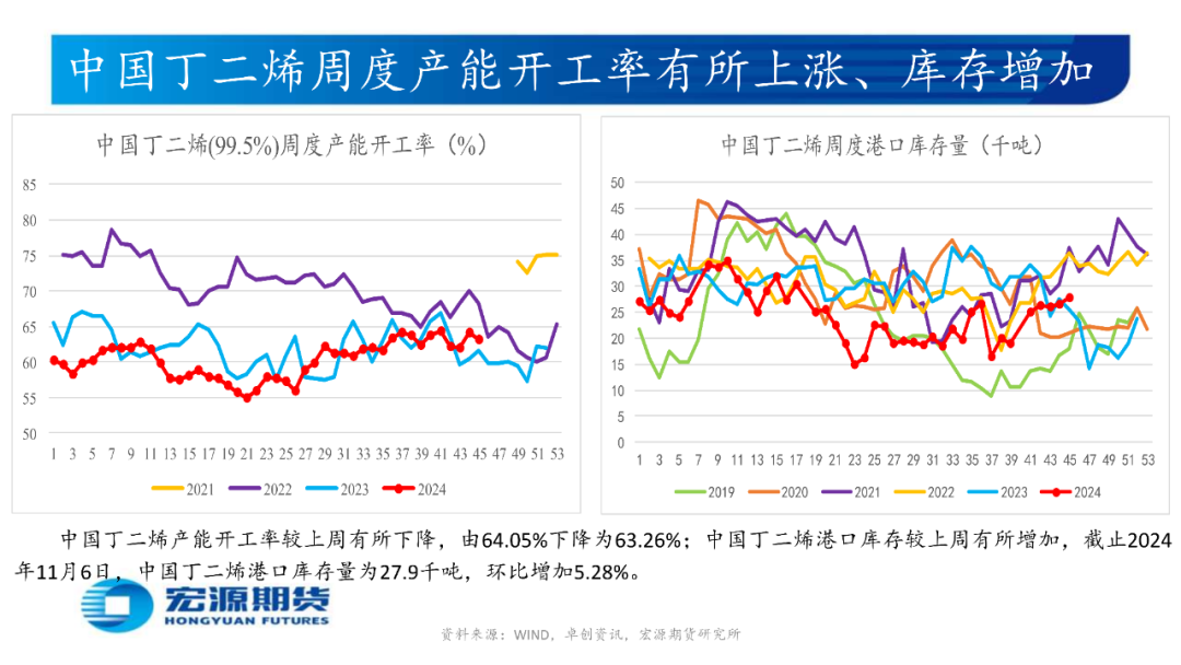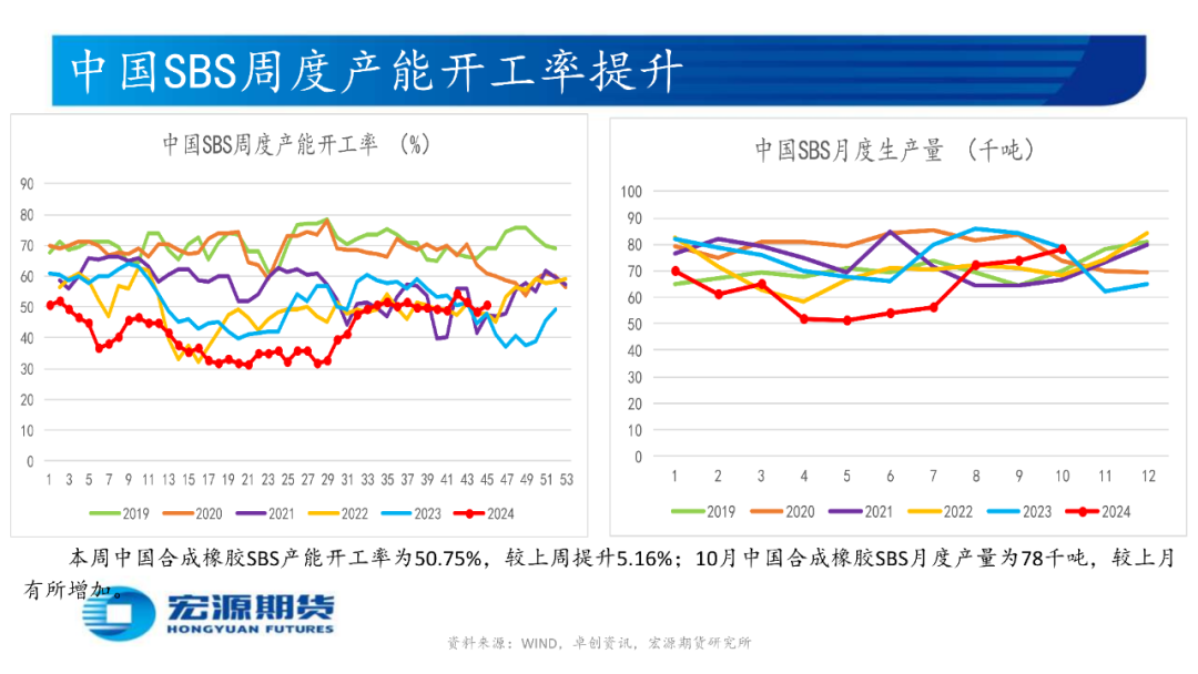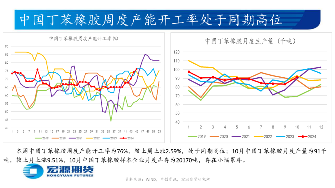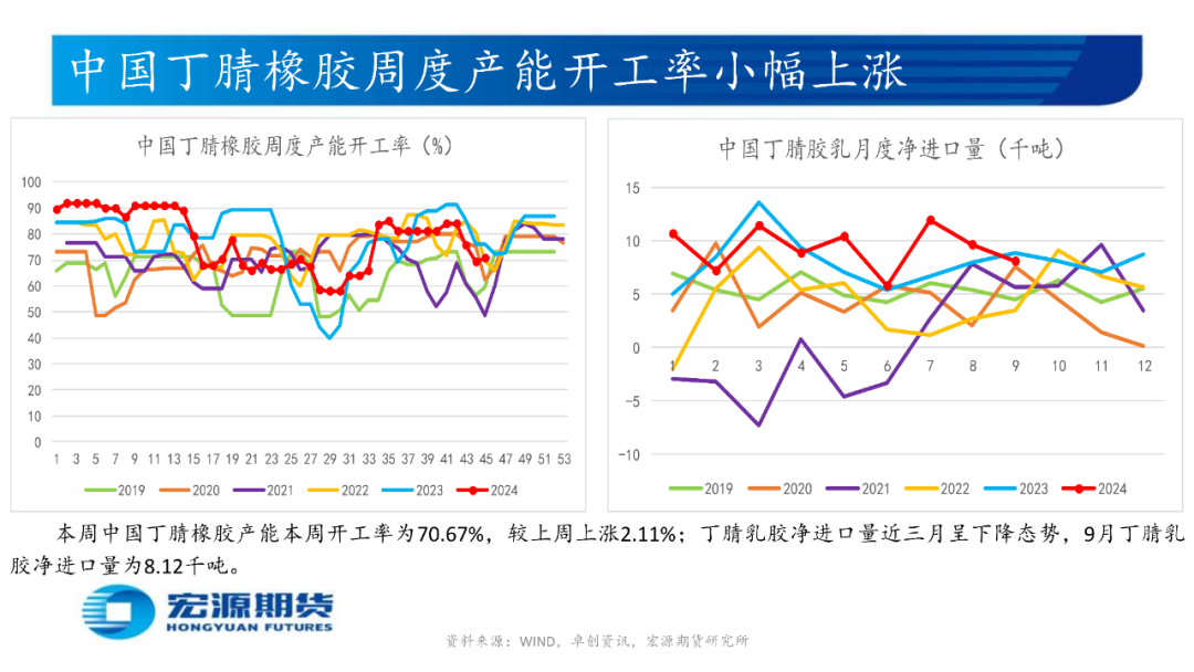 供给端:上周原油市场先涨后跌,美国大选结果落地,特朗普政策主张预期对油价构成利空,欧佩克+推迟增产计划或提供油价支撑,上游原油震荡波动预计影响丁二烯价格走势。近日丁二烯现货相对充足且装置开工稳定,丁二烯价格总体呈现下跌趋势,中国丁二烯周度港口库存为27.9千吨,环比增加5.28%,存在一定库存压力。顺丁橡胶装置开工维持正常生产,中国顺丁橡胶溶液聚合工艺日度税后装置毛利为负,但环比毛利有上升趋势;截止到11月8日,丁苯橡胶行业理论毛利水平高达1688元/吨,创下了年内的最高的毛利水平。合成橡胶装置正常生产供应偏强,供应面缺乏支撑。