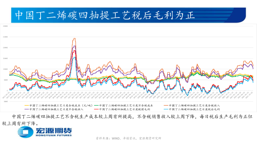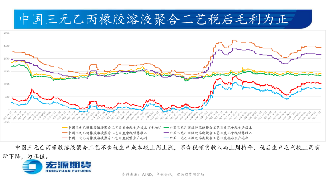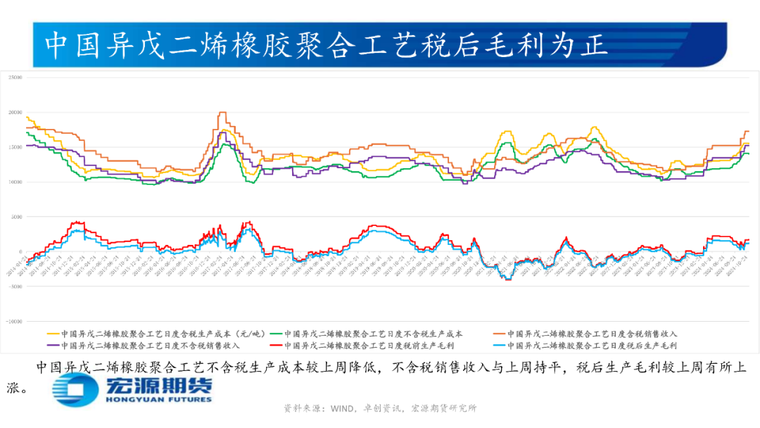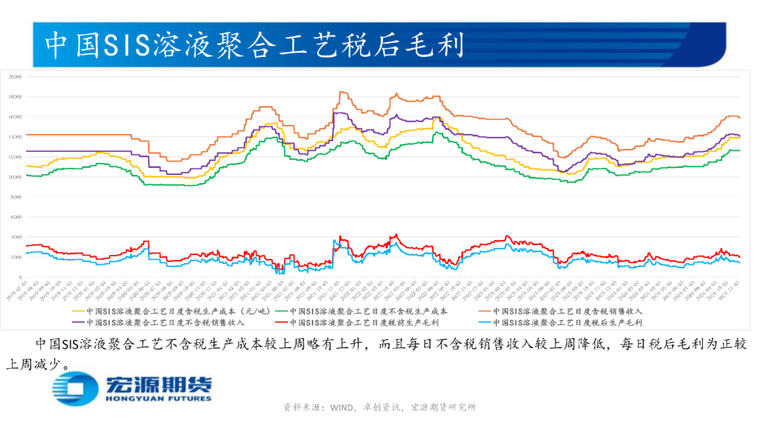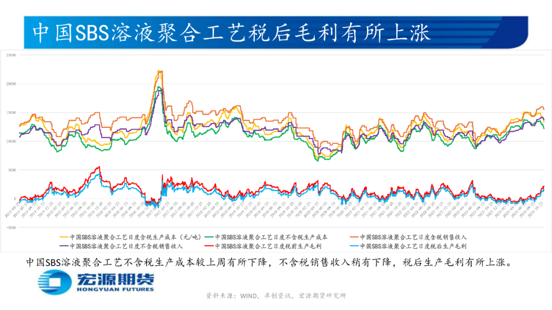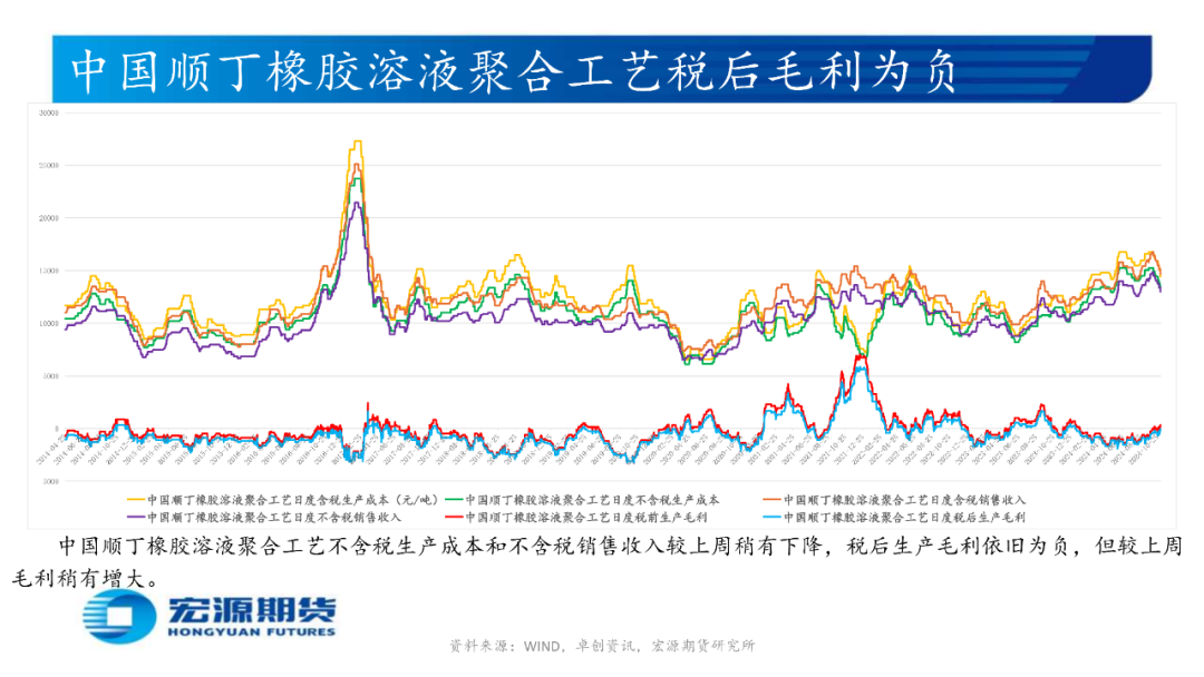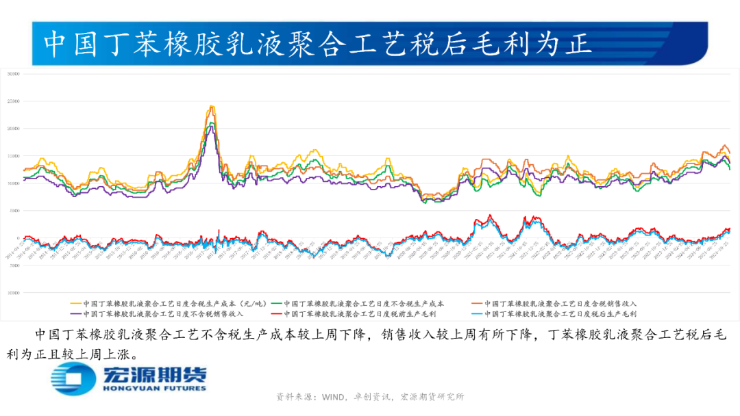 供给端:上周原油市场先涨后跌,美国大选结果落地,特朗普政策主张预期对油价构成利空,欧佩克+推迟增产计划或提供油价支撑,上游原油震荡波动预计影响丁二烯价格走势。近日丁二烯现货相对充足且装置开工稳定,丁二烯价格总体呈现下跌趋势,中国丁二烯周度港口库存为27.9千吨,环比增加5.28%,存在一定库存压力。顺丁橡胶装置开工维持正常生产,中国顺丁橡胶溶液聚合工艺日度税后装置毛利为负,但环比毛利有上升趋势;截止到11月8日,丁苯橡胶行业理论毛利水平高达1688元/吨,创下了年内的最高的毛利水平。合成橡胶装置正常生产供应偏强,供应面缺乏支撑。
