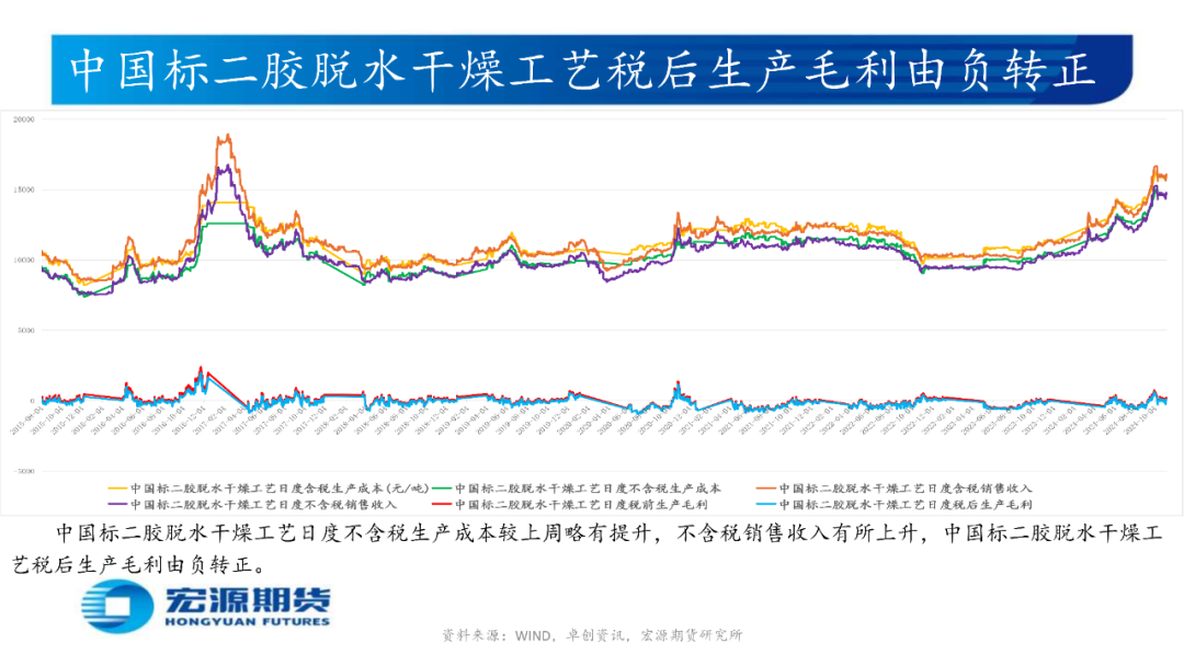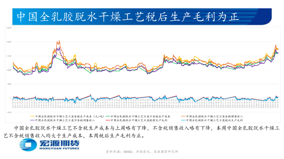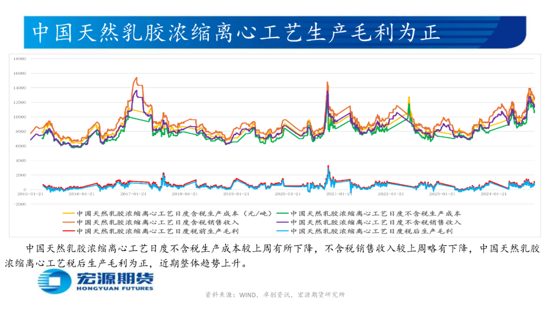 供给端:现阶段处泰国产区原料生产旺季,近期原料胶水价格回升刺激割胶积极性,后续需关注季节