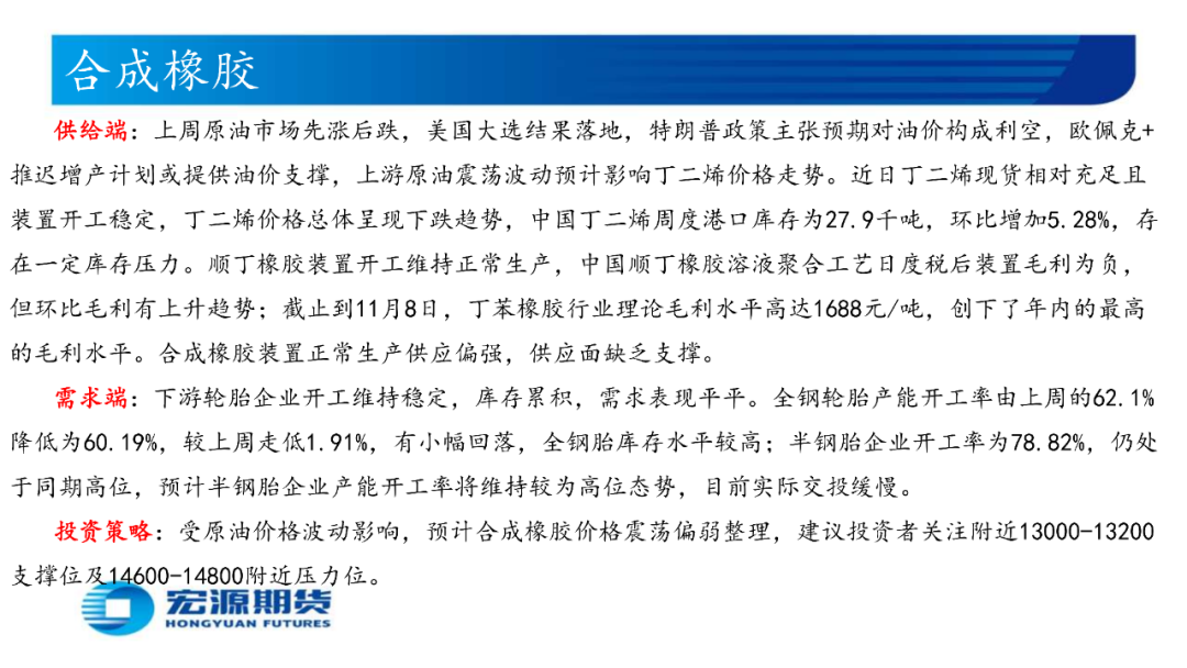 受原油价格波动影响,预计合成橡胶价格震荡偏弱整理,建议投资者关注附近13000-13200支撑位及14600-14800附近压力位。
