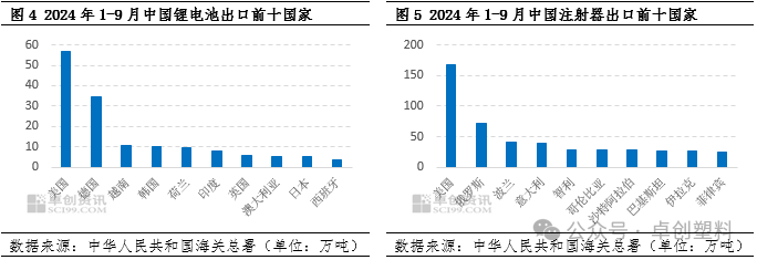 自5月起美国在原有对华301关税基础上,进一步提高对自华进口相关产品的关税水平,涉及聚烯烃相关下游的领域主要集中在电动汽车、锂电池、医疗器材及卫材企业。其中电动汽车关税今年将从目前的25%大幅提升至100%,尽管目前对美出口占比较低,2024年1-9月出口至美国仅有1.25万吨,短期中国出口量暂受影响有限。但在全球电动汽车企业激烈竞争的格局中,100%的关税基本阻止了对美国出口的可能,削弱了未来中国电动汽车在美国的市场份额,进而消除美国对中国供应链形成依赖的隐患。