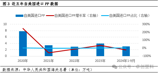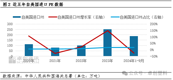 从原料端来看,PE仍是进口依存度较高的产品,2023年以来,受地缘政治以及欧美地区高通胀的影响,全球经济增速放缓,欧美地区市场需求恢复难达预期。为缓解库存压力,美国开始向中国市场增加递盘量,且价格偏低,在内外盘价差存在较大套利空间下,国内贸易商接盘积极性提高,来自美国地区的供应持续增加,进口量一度超过沙特,位居中国PE进口贸易伙伴的第一位,2024年1-9月自美国进口PE体量在189.03万吨,占总进口体量的18.55%,同比去年增加8.51%。PE出口的体量相对较小,2024年1-9月出口至美国的PE体量仅有0.10万吨,因此加征关税对其影响不大。