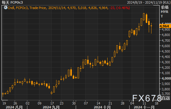 汇通财经APP讯——周四(11月14日)的马来西亚棕榈油期货市场延续疲弱走势,基准合约收于每吨4,964林吉特,下跌23林吉特,跌幅达0.46%。这是连续第三个交易日出现下跌,主要受到竞争对手市场的压制和持续的抛售压力影响。尤其在大连的主要植物油合约普遍下跌的背景下,棕榈油跟随走低,显示了目前全球植物油市场的疲弱态势。