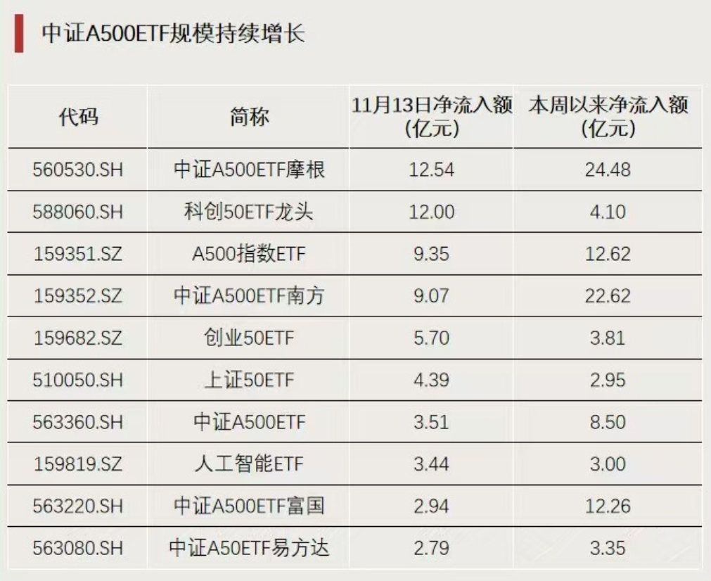 ETF保持资金净流出趋势。11月13日,A股ETF再次出现小幅减仓,合计净流出28.57亿元,其中,科创50ETF、沪深300ETF、创业板ETF、红利低波100ETF、中证1000ETF净流出最多。