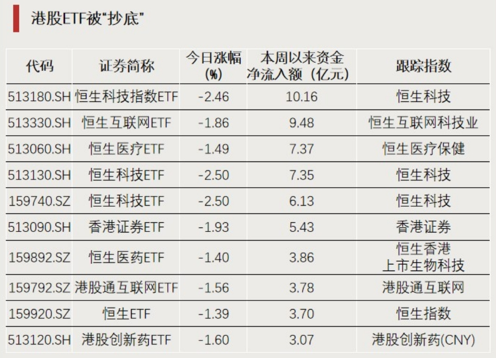 A股ETF普跌,仅金融地产ETF小幅上涨,资金持续净流出,港股ETF被“越跌越买”。本周以来,净流入金额居前的十只恒生科技、香港证券相关ETF合计净流入资金超过60亿元。