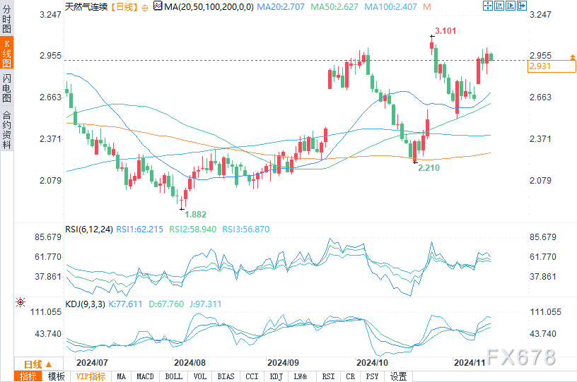 近期内,美国天然气价格将面临下行压力,原因是目前预计的天然气储存建设和美国大部分地区持续的温和气温。然而,11月晚些时候天气转冷,加上液化天然气出口需求稳定,如果供暖需求加速,可能为看涨逆转奠定基础。交易商应密切关注3.044-3.051美元阻力位,因突破该区间可能引发上行动能,而跌破2.825美元可能暗示未来将有进一步的看跌走势。