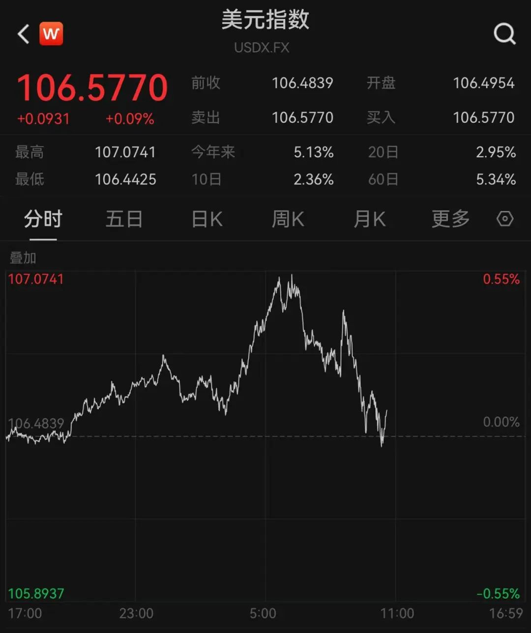 尽管如此,美元指数当日仍收涨0.53%。周四亚洲交易时段,美元指数持续上涨,截至发稿一度触及107.0741,创一年新高。美元延续大涨走势,导致一众非美货币收跌。