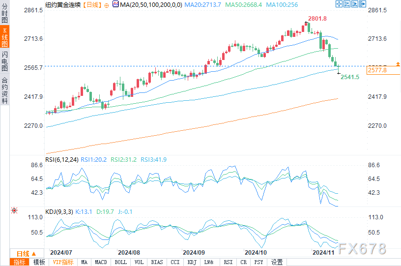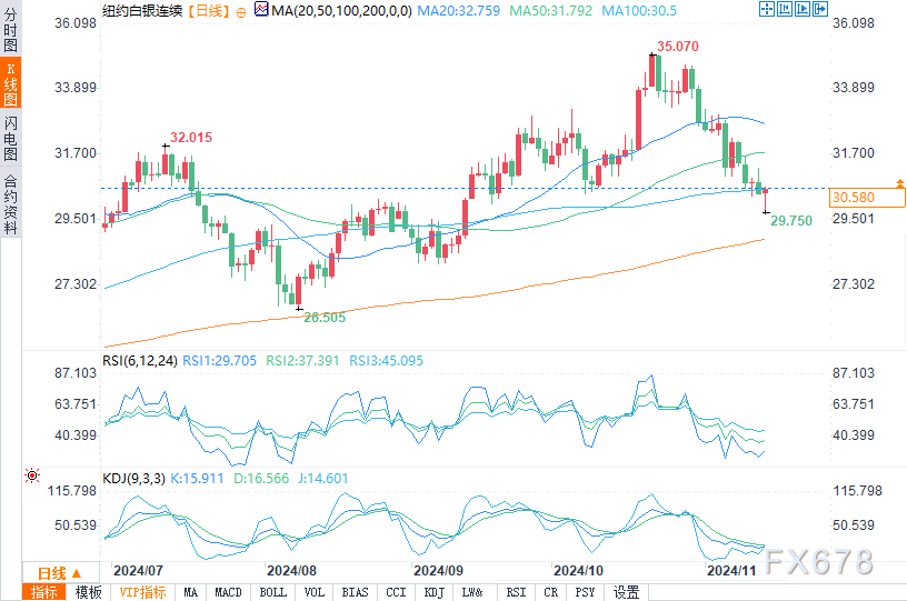 汇通财经APP讯——周四(11月14日)美盘时段,黄金和白银期货价格稳步走低,触及两个月低点。在风险偏好改善、美元飙升和债券收益率上升的背景下,贵金属价格仍在下跌。COMEX12月黄金价格盘中下跌28.20美元,报2558.50美元,COMEX12月白银价格盘中下跌0.468美元,报30.205美元。