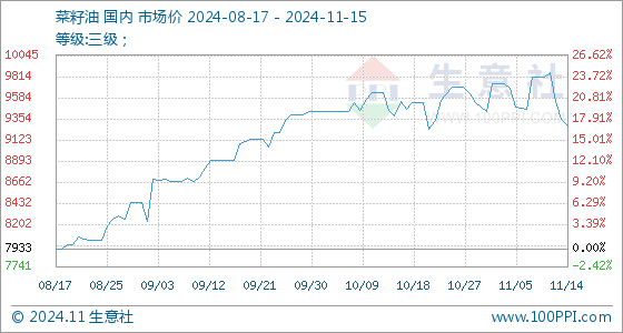 11月15日生意社菜籽油基准价为9276.67元/吨