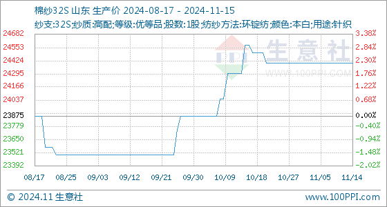 11月15日,生意社棉纱32S基准价为24400.00元/吨,与本月初持平。