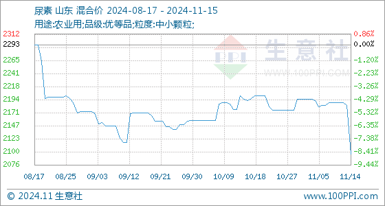11月15日,生意社尿素基准价为2096.25元/吨,与本月初(2195.00元/吨)相比,下降了-4.50%。