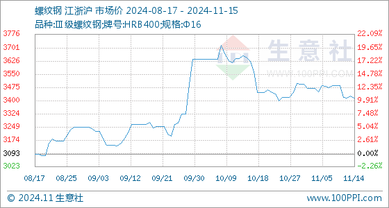 11月15日生意社螺纹钢基准价为3415.71元/吨