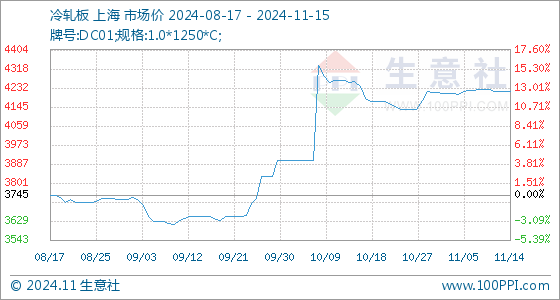 11月15日,生意社冷轧板基准价为4215.00元/吨,与本月初(4212.50元/吨)相比,上涨了0.06%。