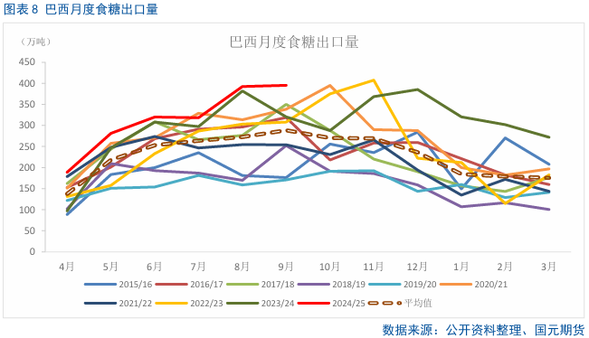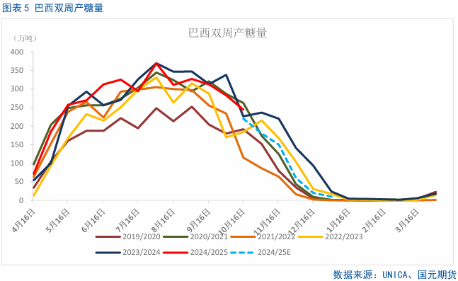 图表5所示,我们对巴西2024/25榨季的10-11月产糖量进行了粗略预估发现,只要处于近6个榨季的平均水平,最终的产糖量达到3800-3950万吨基本问题不大,而且10-11月巴西出现大范围强降雨的可能性比较低,基本不会影响压榨。