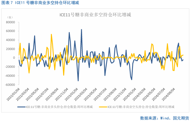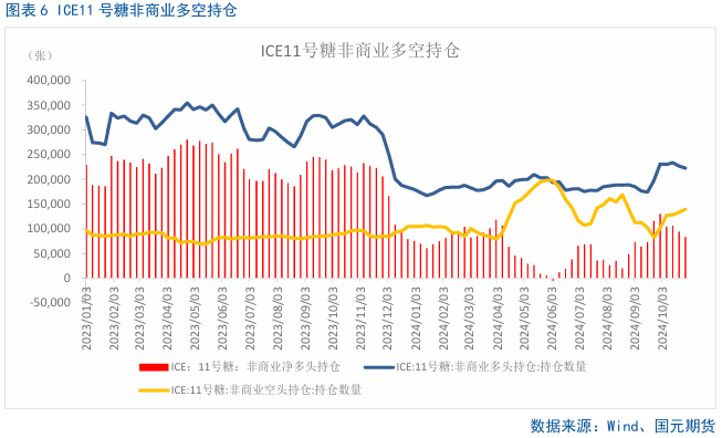 巴西10月上半月糖产高于预期使得市场对巴西供应担忧有所缓解,糖价维持震荡走弱。据CFTC公布的最新周度持仓报告显示,截止10月29日当周,对冲基金及大型投机客持有的原糖净多头仓位为82843手,较之前一周减少10708手,刷新近一个月低位。多头持仓为222539手,较之前一周减少4442手,空头持仓为139696手,实现连续第五周增仓,较之前一周增加6266手。