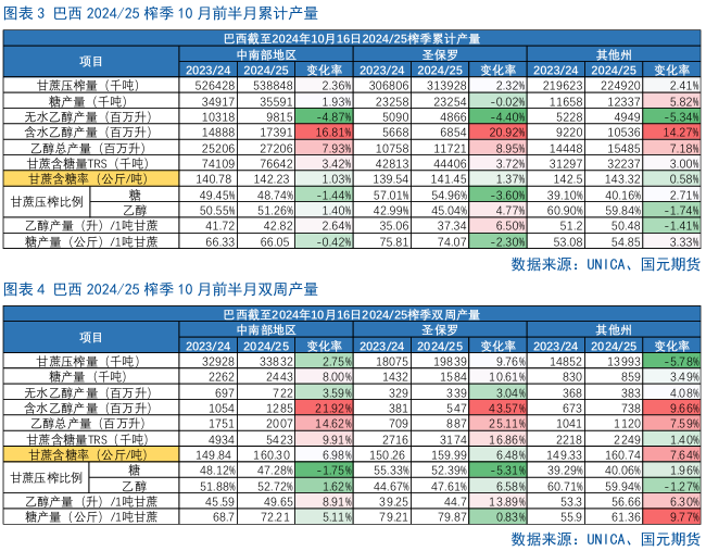巴西2024/25榨季10月上半月甘蔗压榨量3383.2万吨,同比增长2.75%;其中圣保罗州甘蔗压榨量1983.9万吨,同比增长9.76%;10月上半月糖产量244.3万吨,同比增长8.00%;其中圣保罗州糖产量158.4万吨,同比增长10.66%。