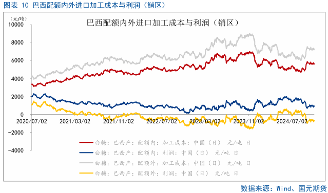 进口利润:中性偏空。当前国内的配额外进口没有点价窗口,目前原白价差没有很好的给出转口加工糖厂利润,国际市场对巴西糖的进口意愿降低。