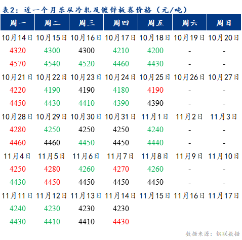 截止2024年11月14日17:30,冷轧板卷月均价为4243元/吨,镀锌板卷月均价为4448元/吨。