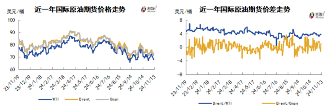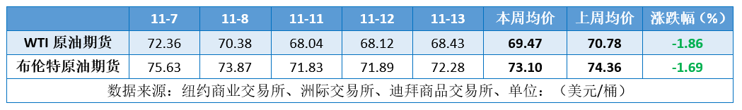 本周(11.7-11.13),原油整体呈现震荡下行的走势,均价环比下跌。