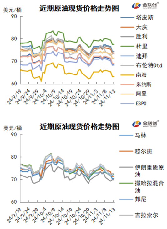 本周,国际原油现货均价环比下跌。中东原油市场方面,卡塔尔能源公司招标销售五船各50万桶2025年1月装al-Shaheen原油船货,船期分别为1月1-2日、1月3-4日、1月16-17日、1月25-26日和1月26-27日,该标书将于11月13日截标,有效期至11月14日。因买家减少合同船货采购,卡塔尔2025年al-Shaheen原油现货船货供应增加。2024年个别月份卡塔尔原油合同船货价格高于现货船货价格。卡塔尔能源公司同时招标销售明年1月装卡塔尔海洋油和卡塔尔陆地油,该标书也将于11月13日截标。上周日本一家能源公司购得一船卡塔尔海洋油船货,但价格不详。此外,科威特下调12月销往亚洲市场的科威特出口原油(KEC)官方售价40美分,至阿曼/迪拜报价均价+0.60美元/桶。