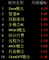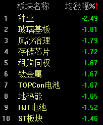 板块方面,AI语料、教育、智谱AI、Kimi概念、Sora概念等涨幅靠前,而半导体、存储芯片、通用航空、转基因、高带宽内存等表现不佳,领跌市场。