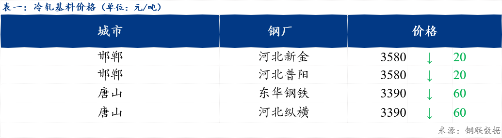 今日北方市场冷轧基料3.0*1010*CSPHC河北普阳价格为3580元/吨,较上一期价格下跌20元/吨,河北纵横价格为3390元/吨,较上一期价格下跌60元/吨。镀锌方面,今日北方市场民营镀锌钢厂指导价格部分下跌10-60元/吨。市场方面,今日热卷期货盘面价格震荡下行,现货市场贸易商议价空间增加,镀冷价差持续收缩,交投氛围清冷,北方市场进入需求淡季,西北部分城市有降雪,贸易商采购计划较为谨慎,需关注资源北材南下情况。