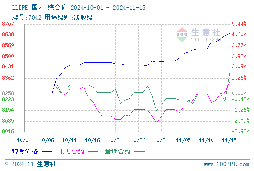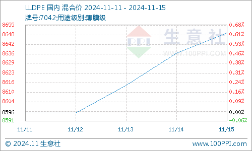 据生意社商品行情分析系统监测,LLDPE(7042)11月11日国内价格在8596元/吨,11月15日均价在8650元/吨,期间报价上涨0.62%。