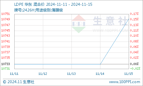 据生意社商品行情分析系统监测,LDPE(2426H)11月11日国内价格在10733元/吨,11月14日均价在10750元/吨,期间报价上涨0.16%。