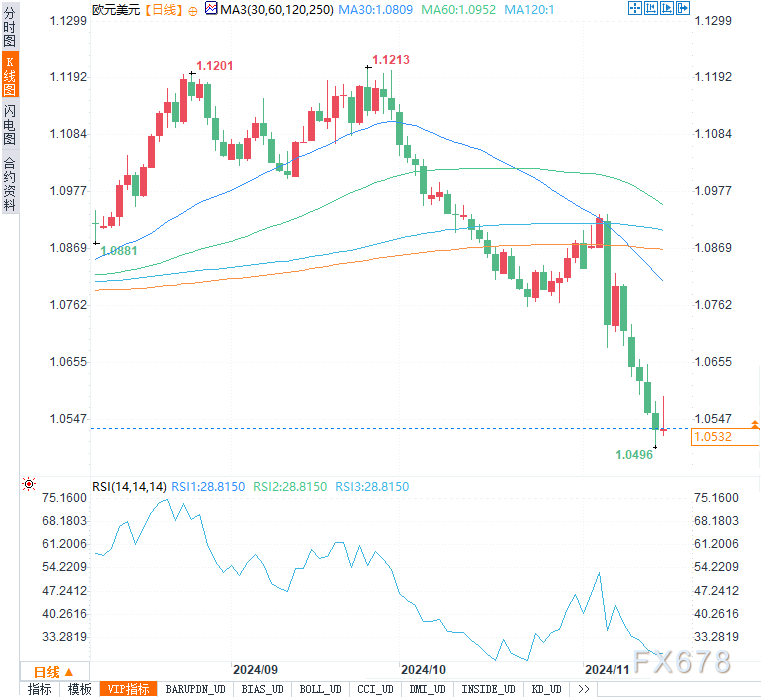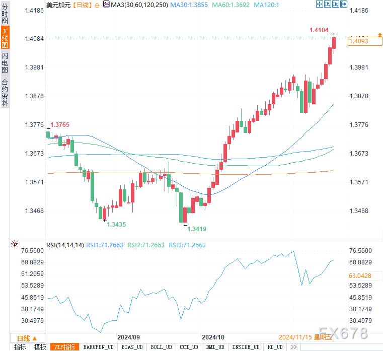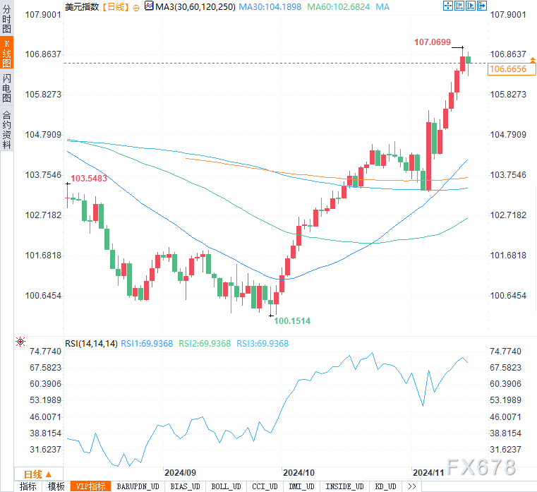 在技术面上,美元兑主要货币全线走强,尤其是兑日元创下7月以来的新高。短期内,美元走势仍受经济数据和政策预期影响,若未来数据进一步证实美国经济的相对强势,美元指数有望继续向107.50迈进。