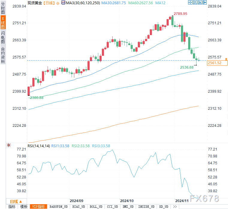 从技术面来看,黄金价格目前处于关键支撑区域2,550美元附近。如果下周未能守住这一水平,可能进一步测试2,500美元的心理关口。RSI指标显示市场进入超卖状态,短期内不排除技术性反弹的可能性。