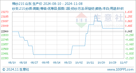 11月8日,生意社棉纱21S基准价为22966.67元/吨,与本月初持平。