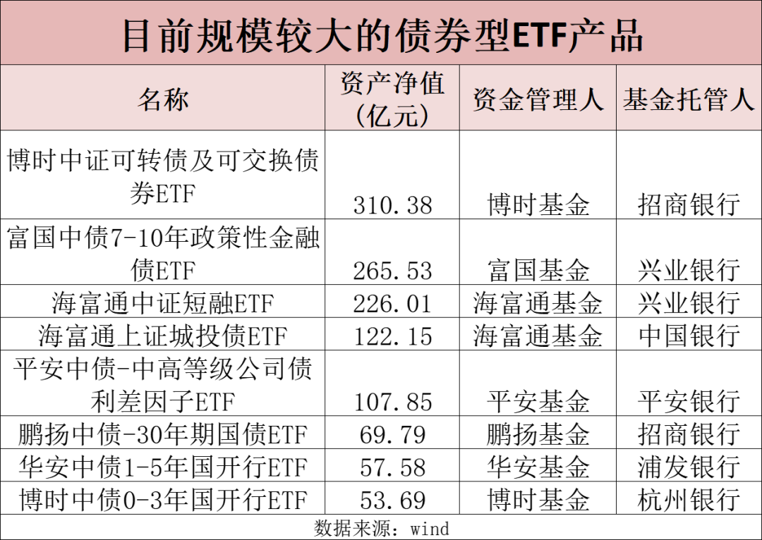 在蓬勃发展的同时,多只百亿级“大块头”债券型ETF相继诞生。目前,博时可转债ETF、富国政金债券ETF、海富通短融ETF、海富通城投债ETF、平安公司债ETF规模相继突破百亿元大关,博时可转债ETF规模更是突破310亿元。