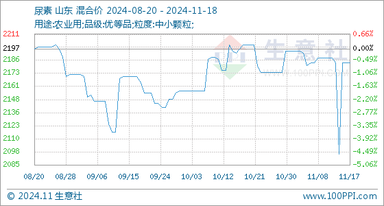 11月18日,生意社尿素基准价为2183.75元/吨,与本月初(2195.00元/吨)相比,下降了-0.51%。