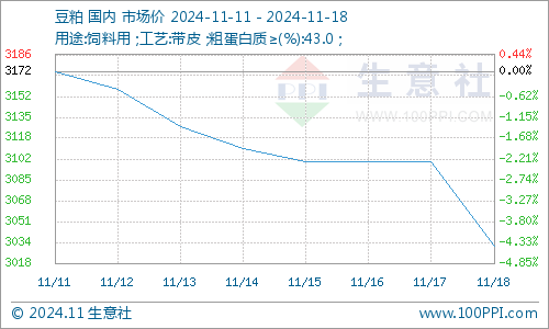 据生意社商品行情分析系统显示:11月11日以来,国内豆粕行情弱势下跌,整体跌幅超4%。11月11日,豆粕市场均价3172元/吨,11月18日,豆粕市场均价3032元/吨,下跌4.41%。